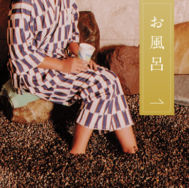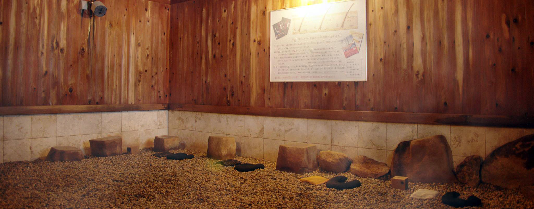 たびやかた嵐の湯の「嵐の湯」は、十五種類の薬石を床、一面に敷き詰め、そこに温水を通し、この温水だけで薬石に熱を加えています。熱くなった薬石はその熱と共に大量のミネラルを発散させます。