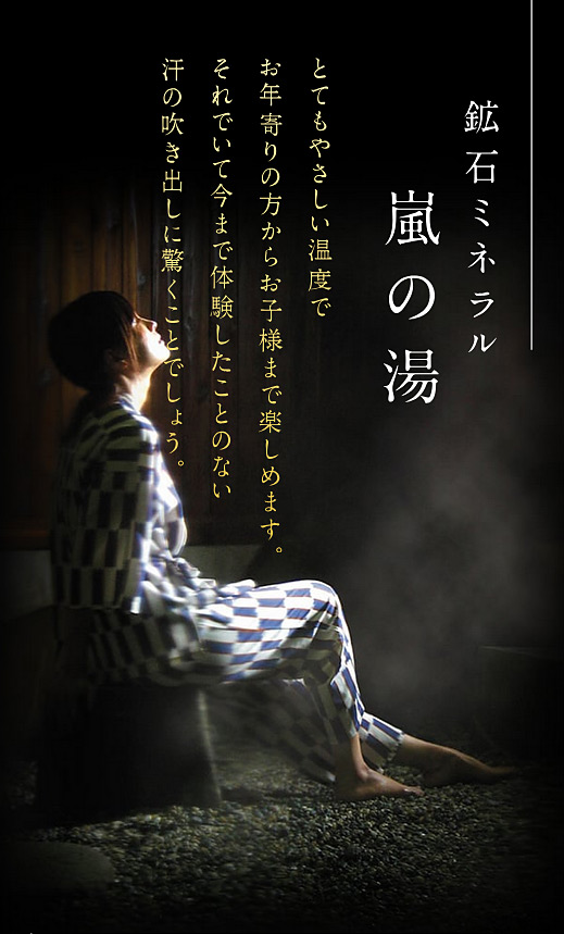 どうぞ鉱物ミネラル嵐の湯と硫酸イオンを満喫して頂き、皆様の健康回復に役立つことを心より願っております。ごゆっくりおくつろぎください。